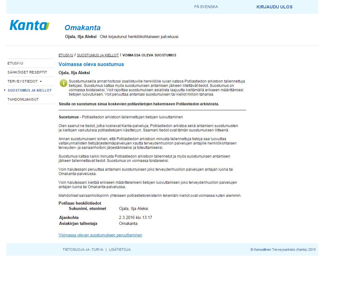 Itse annoin suostumuksen tietojeni käyttöön. Jos sinua mietityttää, missä tietojasi on katseltu, pystyt tarkistamaan asian Omakannassa.