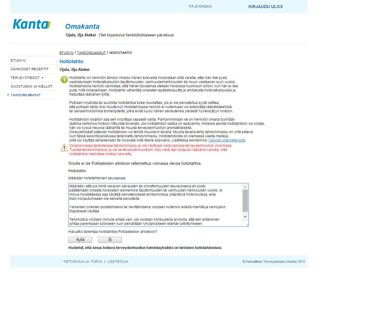 Palveluun voi myös kirjata oman hoitotahtonsa. Tahdonilmaus on periaatteessa vapaamuotoinen, mutta väärinkäsitysten välttämiseksi voi käyttää valmista tekstipohjaa. Oman hoitotahtoni lainasin Terveyden ja hyvinvoinnin laitoksen internetsivuilta.