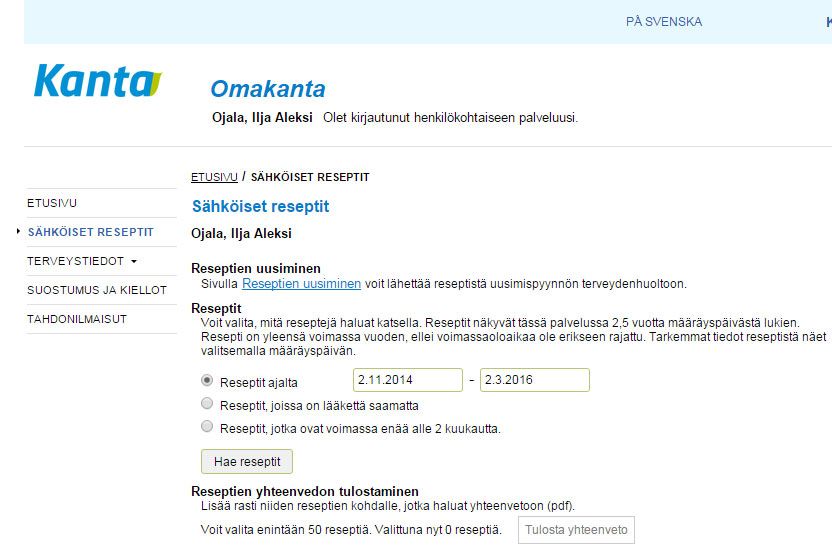 Kirjautumisen jälkeen pääset katselemaan tietojasi. Sähköiset reseptit -kohdassa näet kaikki voimassa olevat reseptisi. Voit myös pyytää reseptin uusimista, mutta kaikki lääkärit eivät vielä ota vastaan uusimispyyntöjä. Reseptit näkyvät myös missä tahansa apteekissa Suomessa, joten paperista lääkemääräystä ei tarvitse kantaa mukana.