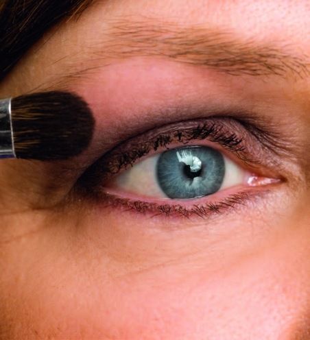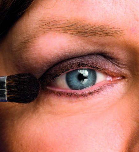 2. Levitä luomiväriä suurella siveltimelläaivan ripsien tyvestä koko liikkuvalle luomelle ja luomivakoon. Tumman luomivärin tulee nousta luomen raskaimman ja pulleimman kohdan yli.