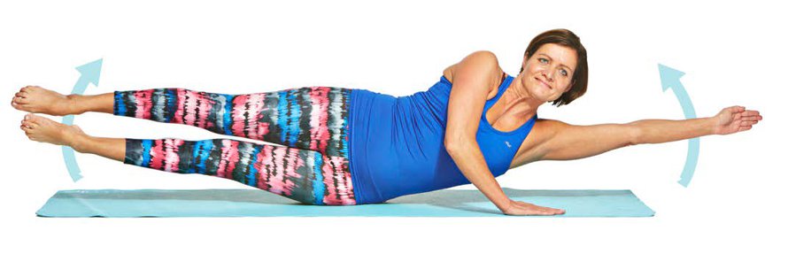 Käy makaamaan kyljellesi. Nosta uloshengityksellä jalat ja käsi suorina ylös. Pidä hetki ja laske alas. Kun olet tehnyt ensimmäisen puolen, vaihda toiselle.