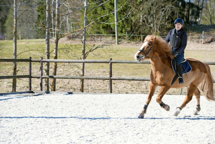 "Lapsuudenkotini lähellä oli kartanon hevostalli, jossa oli neljä työhevosta, ja sain viedä niitä hakaan ja ruokkia. Ratsastuksesta innostuin vasta kuusikymppisenä. Soitin Suomen Ratsastajainliittoon ja kysyin, mistä löytäisin tämän ikäiselle sopivia talleja.