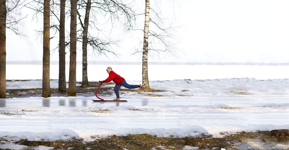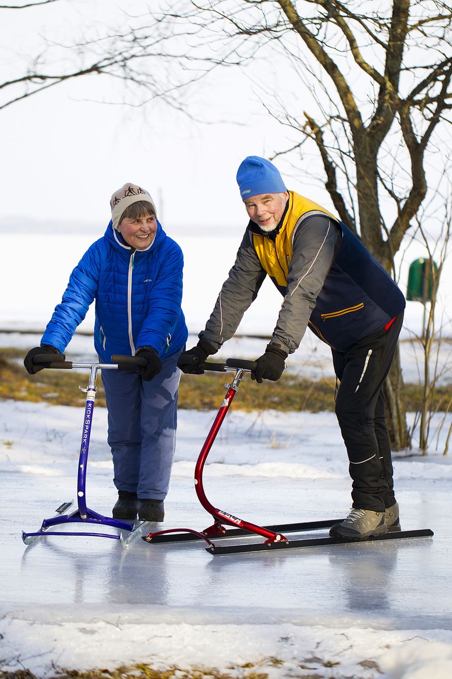 – Potkukelkkailu tekee hyvää jaloille ja hengityselimille. Minulla on aina piikkarit jalassa, jotta saan jäästä napakan tuntuman. Mutta yhtä hyvin voi laittaa kenkään raudat. Potkuttelua kannattaa kokeilla, se on hauskaa ja tehokasta liikuntaa.