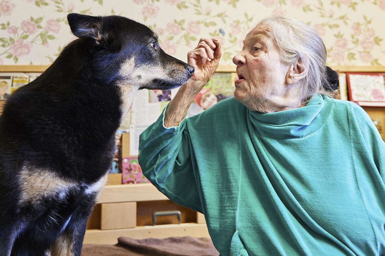 Palvelukeskuksessa asuva Liisa Raunio, 86, ilahtuu, kun hänen hoitajansa lapinporokoira tulee kylään.