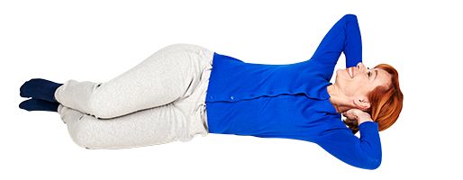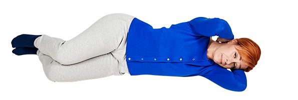Asetu vasemmalle kyljelle polvet koukussa, tyyny pään alla (ylempi kuva). Laita kädet ristiin takaraivolle. Kierrä oikeaa kyynärpäätä uloshengityksellä oikealle siten, että rintakehä kääntyy kohti kattoa. Anna katseen seurata mukana (alempi kuva). Palauta asento sisäänhengityksellä. Pidä jalat ja lantio paikoillaan, liike tapahtuu rintarangassa. Jatka liikettä rauhalliseen tahtiin auki–kiinni 1–2 minuutin ajan ja vaihda sitten puolta.