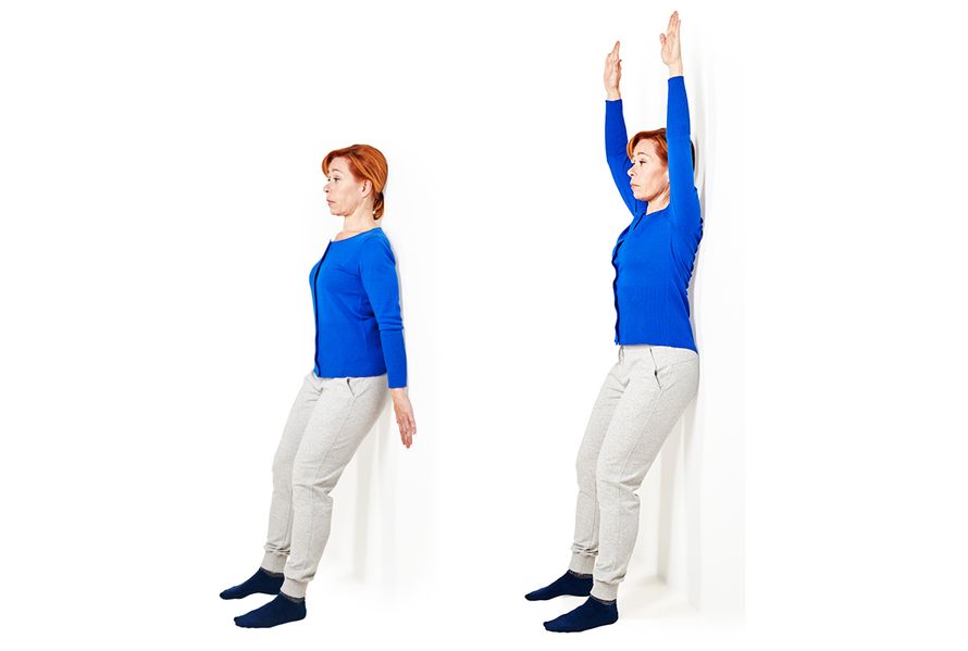 Seiso selkä seinää vasten jalat rinnakkain, kantapäät puolentoista askeleen päässä seinästä. Pakarat, hartiat ja takaraivo pysyvät koko ajan kiinni seinässä. Nosta kädet hartianleveydeltä etukautta suorana ylös niin pitkälle kuin mahdollista. Käännä kämmenselät seinää vasten. Älä taivuta kyynärpäitä tai ranteita.