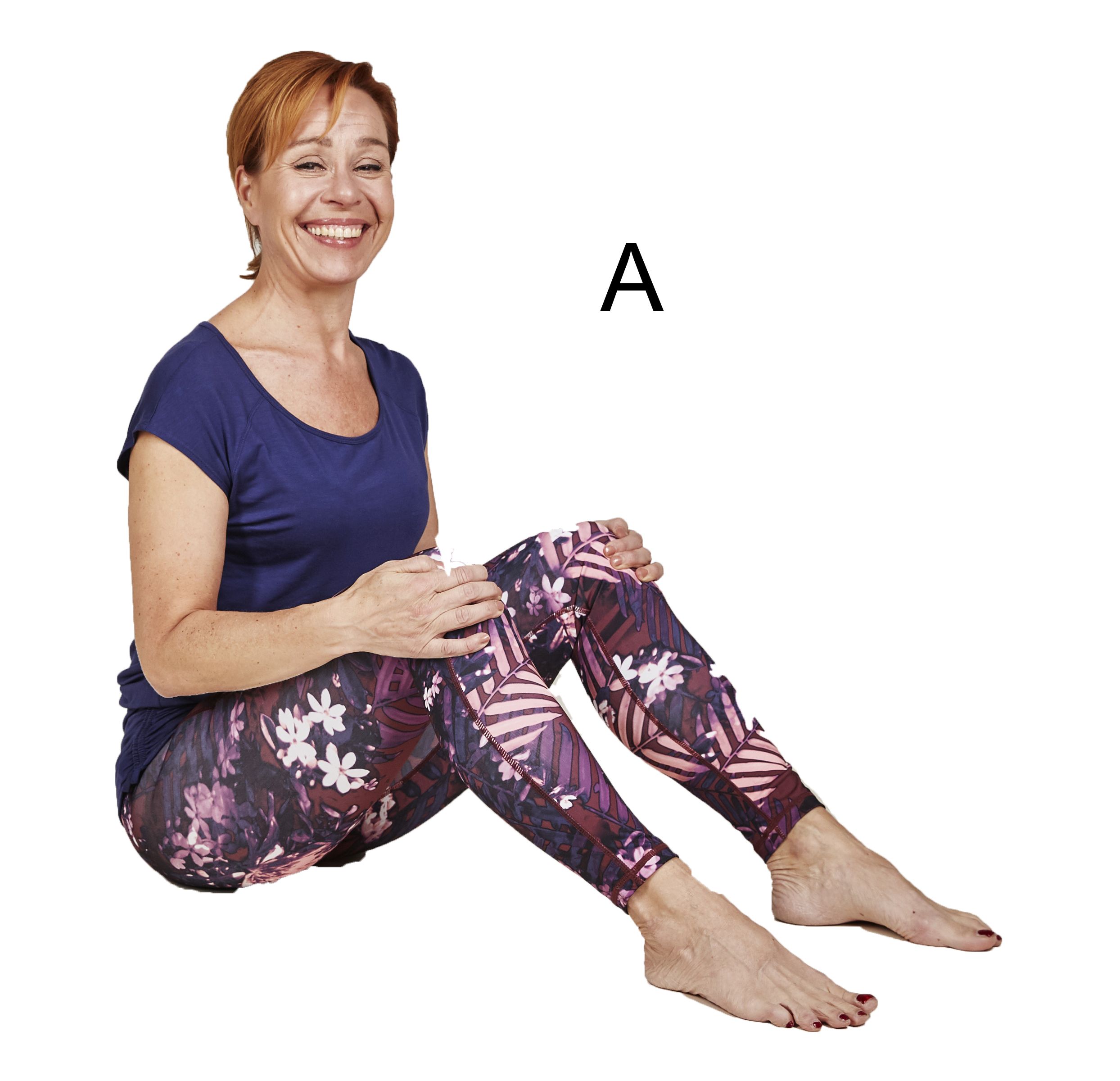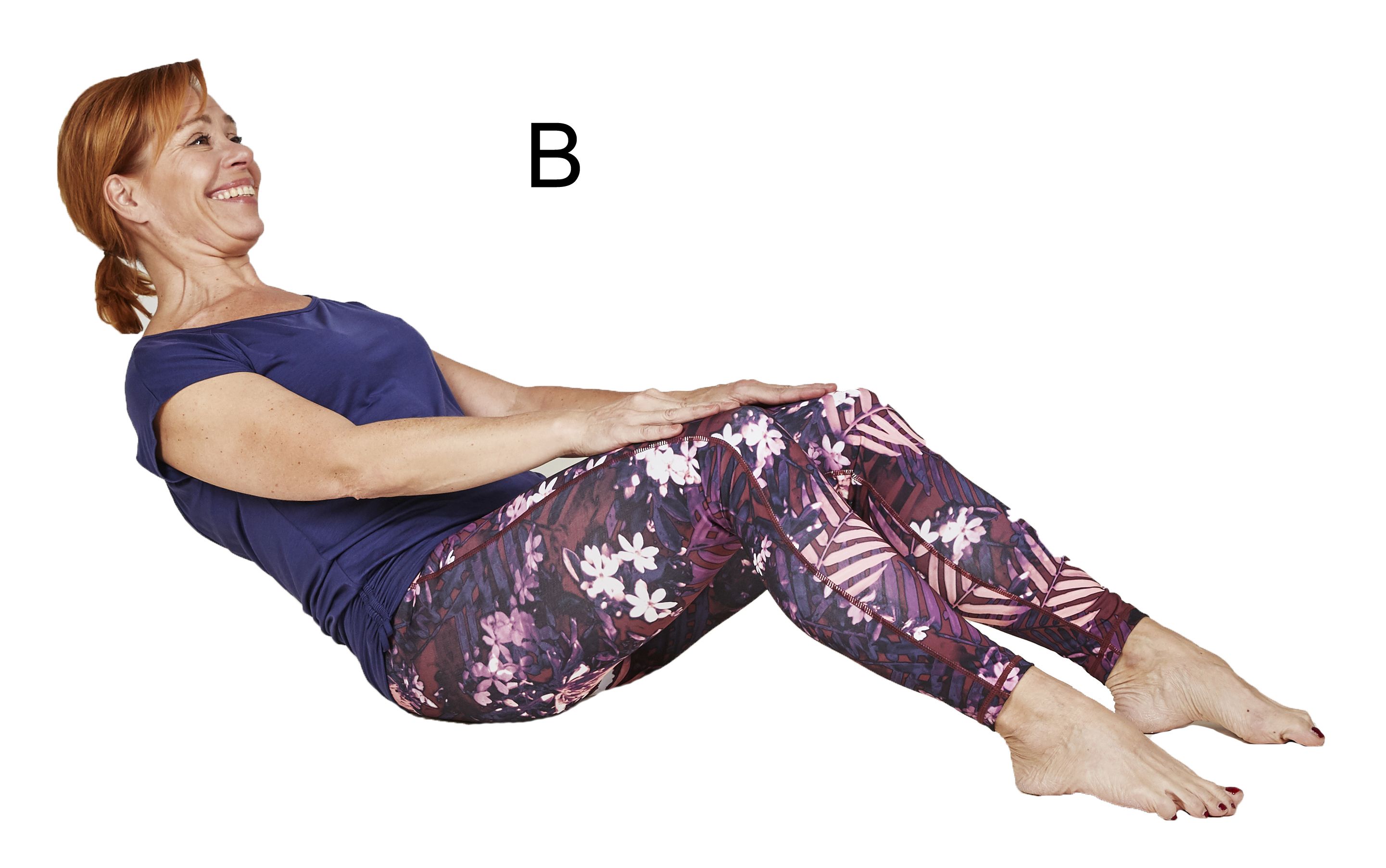 Istu lattialla jalat koukussa, jalkapohjat maassa (A). Aktivoi keskivartalo vetämällä napaa sisään ja ylös ja laskeudu selkä suorana sopivaan kohtaan, jossa liike pysyy vielä hallittuna (B). Selkää ei ole tarkoitus laskea lattiaan asti. Pysy ala-asennossa 2–5 sekuntia ja palaa hallitusti ylös ryhdikkääseen asentoon.
