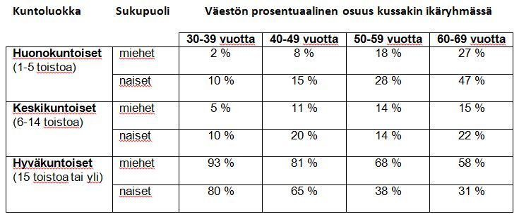 Alla näet vatsalihasten toistotestin viitearvot. Taulukossa vertaillaan, miten eri ikäluokat ovat pärjänneet testissä prosentuaalisesti koko väestöön verrattuna. Siinä ei siis verrata tuloksia ja kuntoluokkia toistomäärien perusteella.