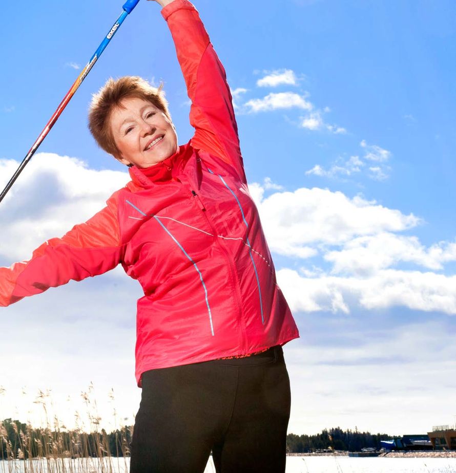 Jäin muutama vuosi sitten eläkkeelle kansainvälisistä järjestötehtävistä, ja liikunta on nykyään etusijalla elämässäni tekstiilitaideopintojen ohella. Käyn viitisen kertaa viikossa jumpassa tai salilla, sauvakävelen, hiihdän ja pyöräilen.