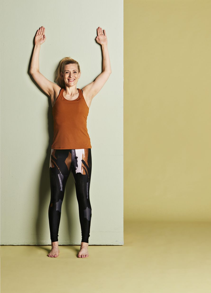 Nosta kädet suorina etukautta ylös ja pyri viemään sormenpäät tai kämmenselät seinään. Yletätkö?