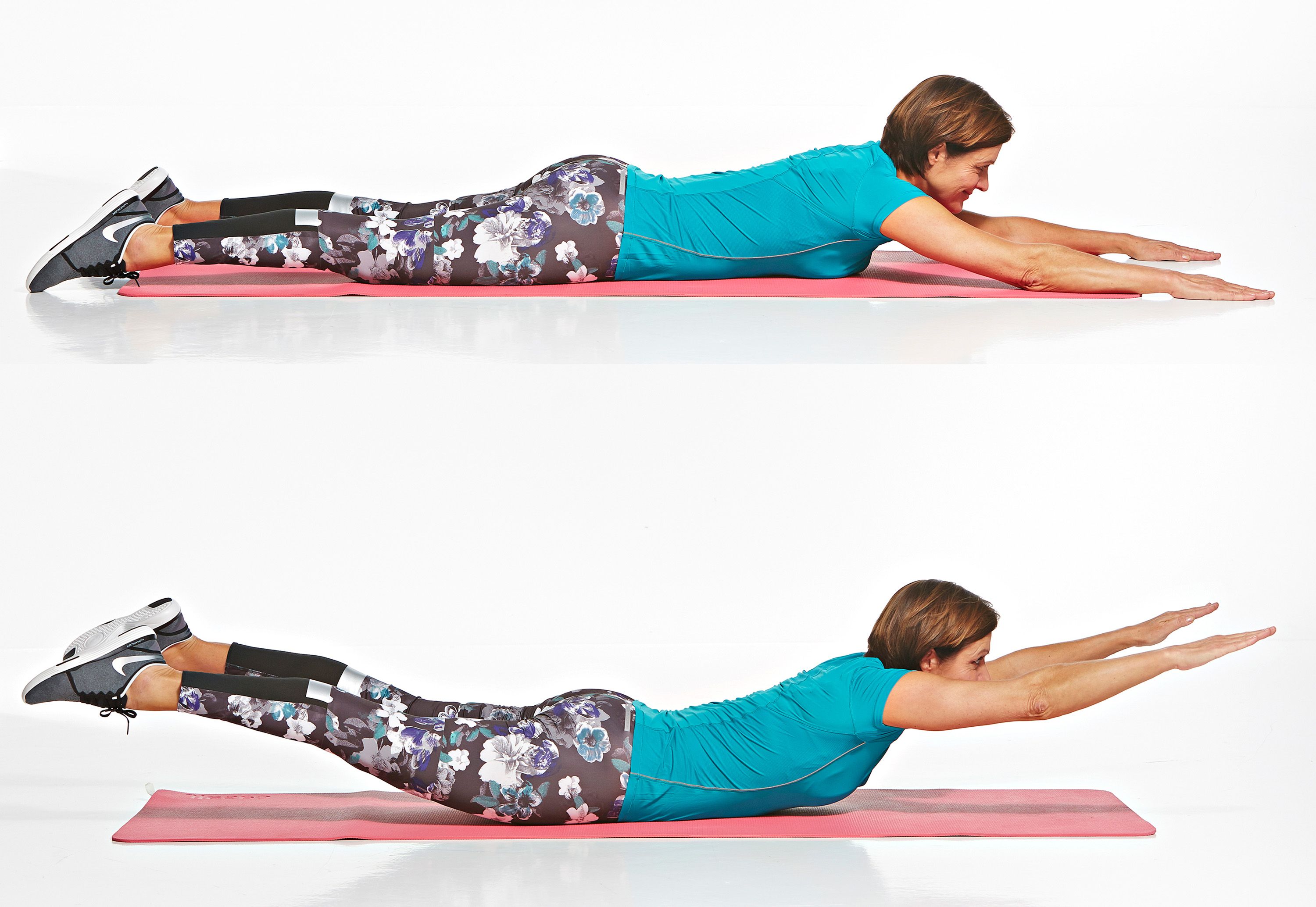 Asetu päinmakuulle. Ojenna kädet eteen vartalon jatkoksi. Nosta kädet ja jalat hieman irti alustasta. Pidä hetki ja laske alas.
