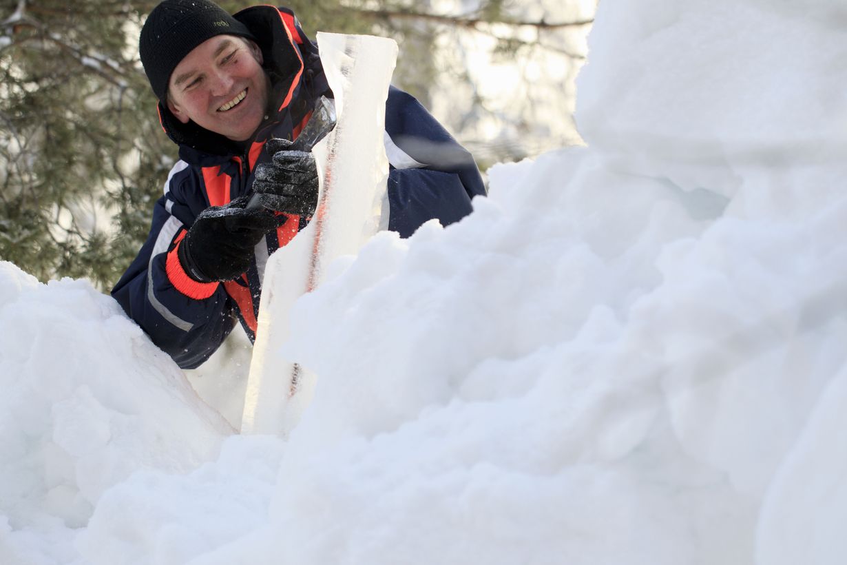 – Pärjääminen on pitkälle varustelukysymys. Lämpöiset haalarit ja kerrospukeutuminen auttavat. Veistäessä liikkuu miltei koko ajan, joten välillä tulee hiki. Kun työ sujuu oikein hyvin, sitä vain veistää ja veistää. On kilpailuja, joissa unohtaa jopa syödä, hän virnistää.