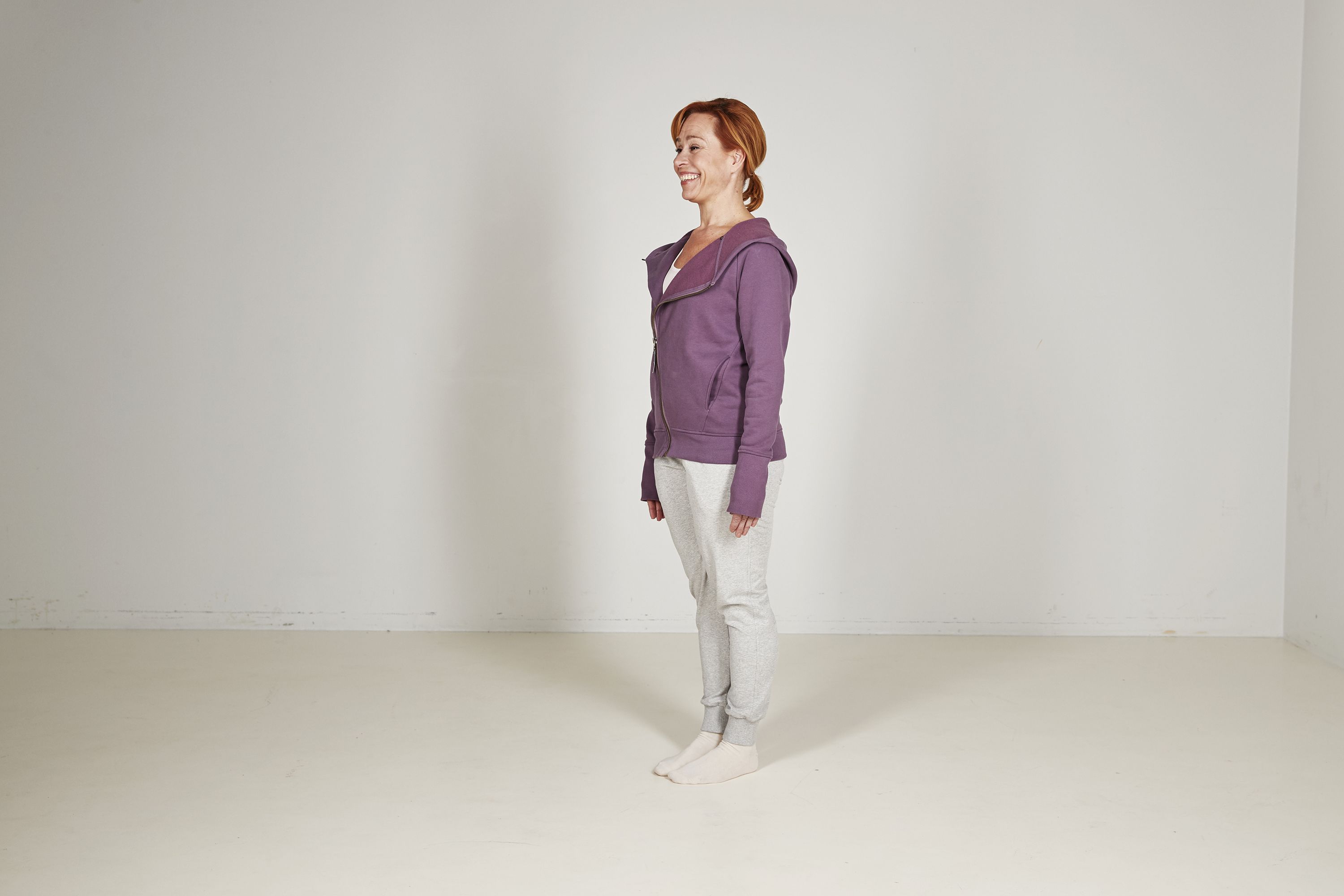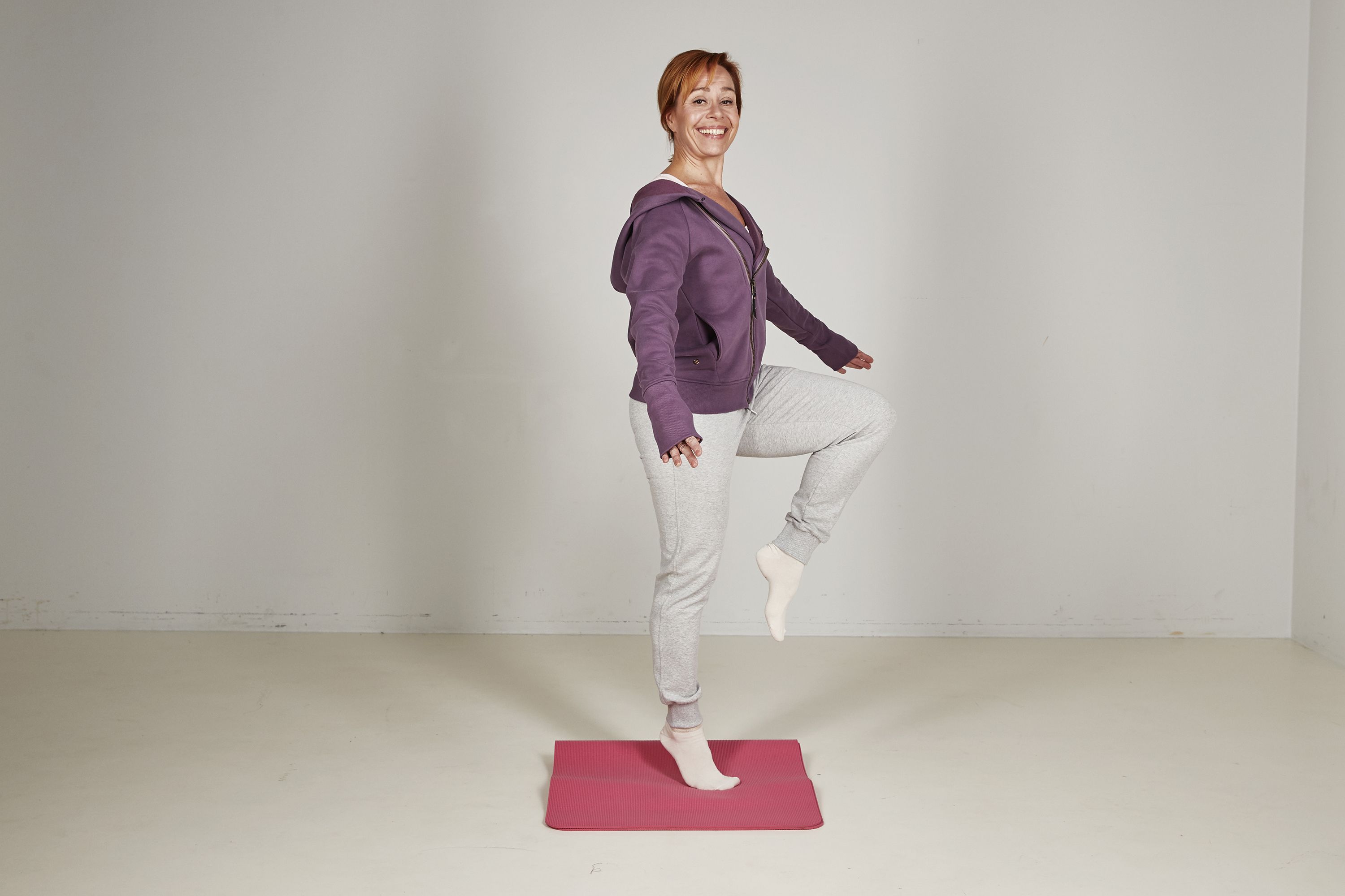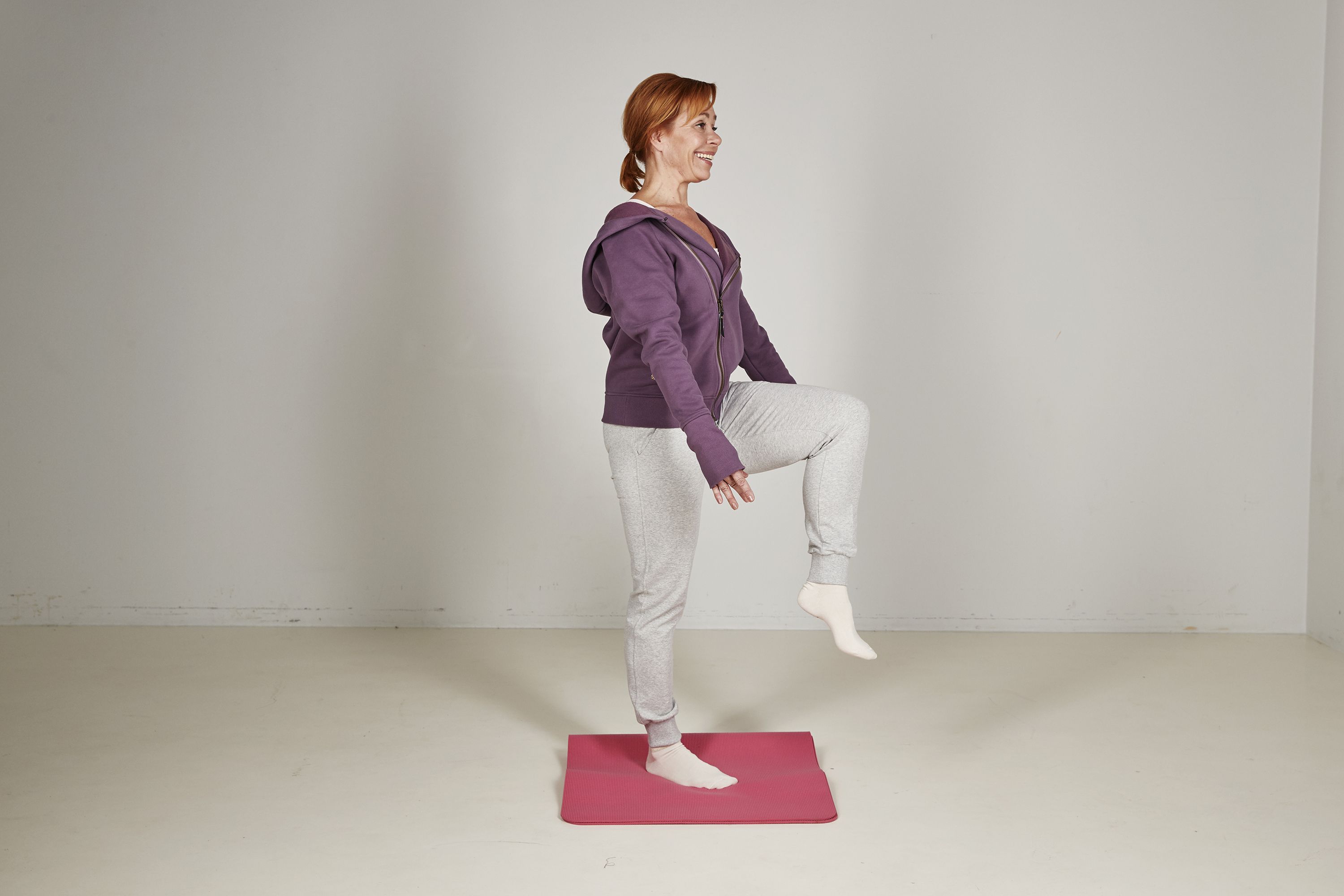 Seiso ryhdikkäästi, pidä kädet vartalon vierellä ja nosta toinen polvi ylös. Jos tämä tuntuu helpolta, tee liike pehmeällä alustalla, kuten tyynyn tai taitellun pyyhkeen päällä. Tasapaino kehittyy parhaiten silloin, kun harjoitus horjuttaa. Voit siirtää koukussa olevaa jalkaa sivulle. Haasta itseäsi myös nousemalla varpaille tai sulkemalla silmät. Pidä jalkaa koukussa hetki ja laske alas. Toista 5–10 kertaa molemmilla jaloilla.