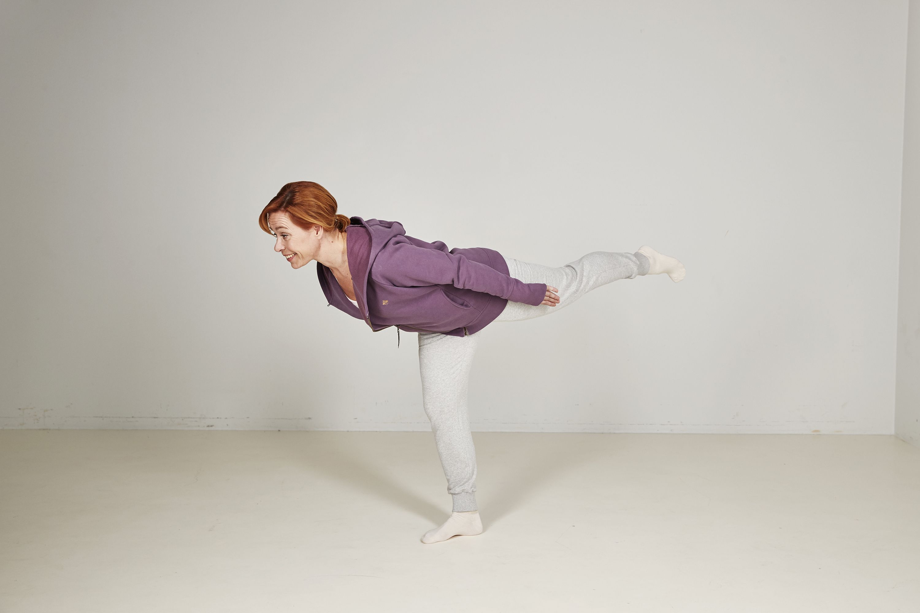 Seiso ryhdikkäässä perusasennossa. Siirrä paino toiselle jalalle ja kallista ylävartaloa eteen samalla kun vapaa jalka nousee takana ylös. Pidä tukijalka aavistuksen koukussa ja vartalo mahdollisimman suorassa linjassa, kädet vartalon vierellä. Pidä niska pitkänä selän jatkeena. Aktivoi myös keskivartalon korsetti tiivistämällä napaa ja nostamalla lantionpohjaa ylös. Nouse takaisin pystyasentoon.