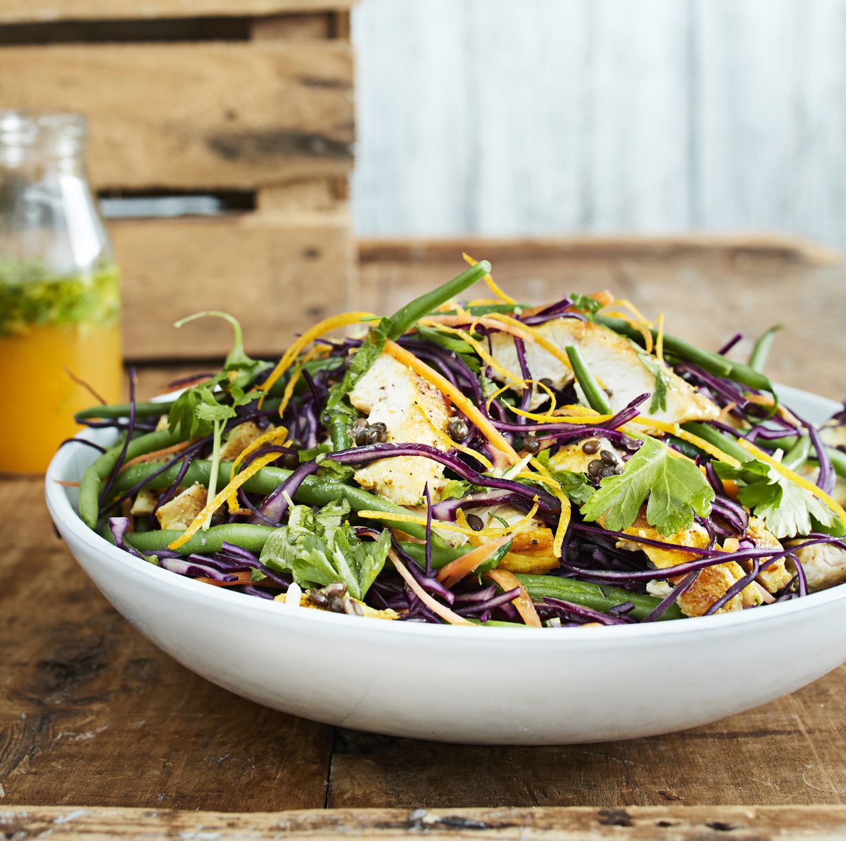 - Lisää linssit ja pavut porkkana- ja punakaalisuikaleiden joukkoon. Viipaloi broilerinfileet ja sekoita salaatin joukkoon.
