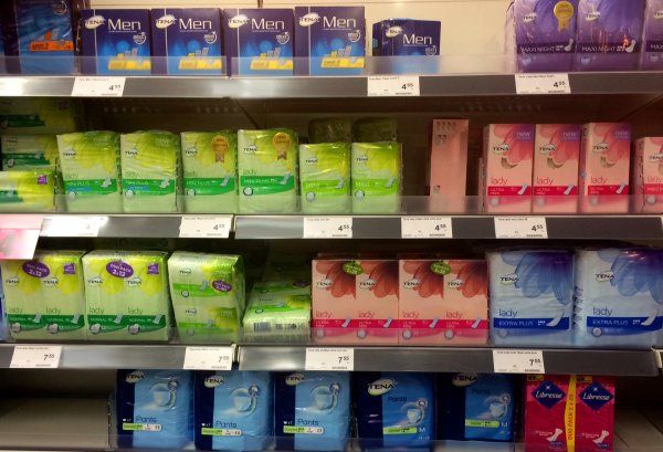 Valtava tarjonta yllättää lähimarketissa: esillä on lähes 20 erilaista inkontinenssisuojaa, monta eri merkkiä. Miehille ja naisille omansa. On ohuita, paksuja sekä housumaisia suojia. Kokonainen suuri hyllyrivistö inkontinenssisuojia – enemmän kuin naisten kuukautissuojia.