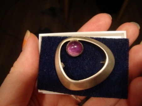 Kysyjän korun leimat kertovat, että rintaneula on leimattu Helsingissä 1962 ja se on hopeaa, pitoisuus on 916/1000. Yksi leimoista on Kupittaan Kullan ”monogrammi”.