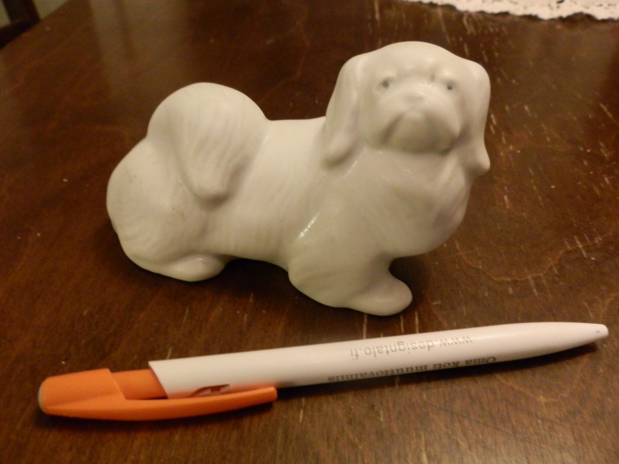 Värin harvinaisuudesta en totisesti tiedä, mutta monivärikoristelu näissä yleensä on. Ja kun valkea koira on leimattu, se kyllä on tarkoitettu myyntiin. Kiinanpalatsikoira elikäs pekingeesi on Lea von Mickwitzin Arabialle jolloinkin 1950-luvulla suunnittelema. Näistä pyydetään tämän päivän keräilymarkkinoilla monenlaisia hintoja, haarukka 100–200 euroa.