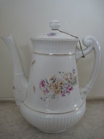 Minkä niminen ja arvoinen tämä kahvi/teekannu on? Pohjassa on ruskea kaunokirjoitusleima Arabia, lisäksi on numeroita ja kirjaimia. Kannu on ehjä, mutta kultauksissa on kulumaa. Anna-Liisa