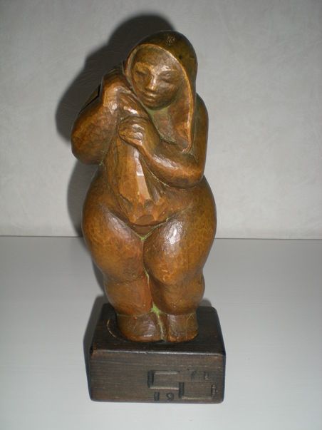 Saunatytöltähän kysyjän hahmo vaikuttaa, numero pohjassa voisi viitata näyttelyluetteloon. Muutaman harvan hintanoteerauksen perusteella arvelisin, että veistoksen päivän hinta on n. 250–300 euroa.