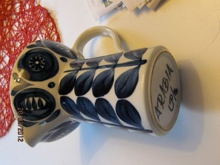 Ruskeassa kannussa on suunnittelijan puumerkki, U.P. eli Ulla Procopé, joka työskenteli Arabian tehtaalla 1940-luvulta vuoteen 1966. Pohjan signeerauksen jälkeen on kauttaviivalla erotettu esineen maalarin nimikirjaimet.
