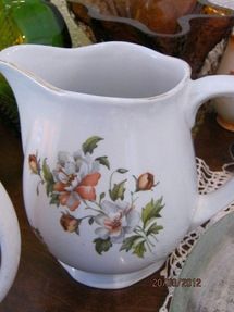 Valkopohjaisen, kukkakoristeisen kannun tekijä on yksinkertaisesti vain Arabia, valmistusajankohta jolloinkin 1930–50-luvuilla. Arabia oli 1930-luvulla suuri tehdas, jolla oli satoja koristemalleja ja kymmeniä tuhansia nimikkeitä, joista vain harvoilla oli nimi.
