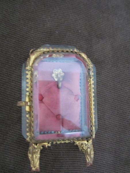 Löysin mummolan vintiltä jokin vuosi sitten vanhan lasisen rasian. Veikkaan, että siinä olisi joskus ollut sormus riippumassa. Sisällä on punertava kangastoppaus, jonka päällä on pieni koukku. Siinä sormus on voinut roikkua. Rasia on kuin pienois lasikaappi, siinä on pieni saranallinen luukku ja se seisoo neljällä jalalla. Rasia on kymmenen senttiä korkea, kuusi senttiä leveä ja neljä senttiä syvä. Kankaan alla on metallinen taustalevy. Haluaisin tietää rasian taustaa ja arvon.Tuija