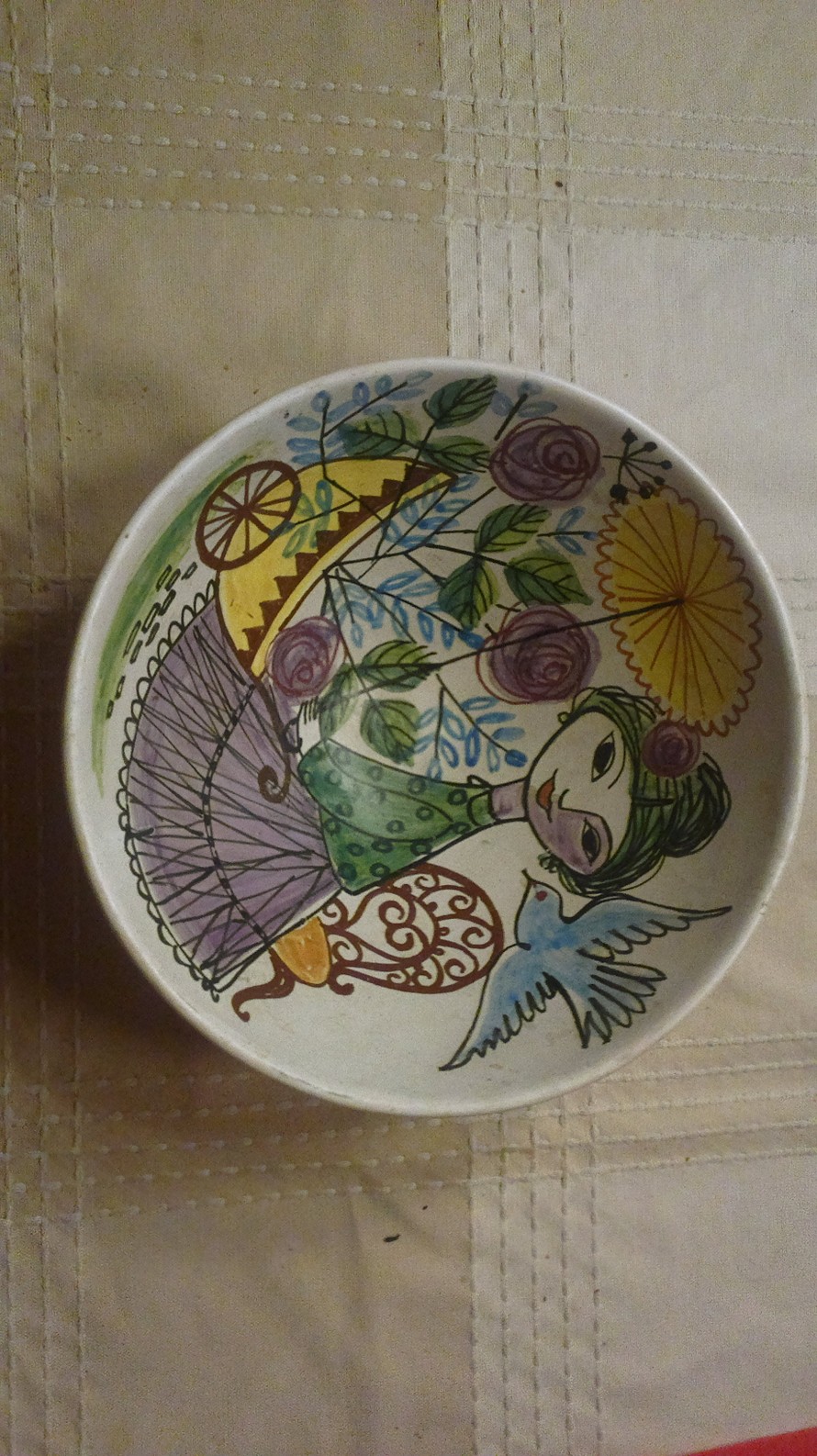Olen parikymmentä vuotta sitten saanut mummoni jäämistöstä kauniin vadin, minun silmissäni ainakin kauniin. Otaksuisin, että mummoni sai sen läksiäislahjaksi Arabian tehtailta. Pohjassa on merkintä Made in Finland ja kirjain, joka taitaa olla Z. Vatiin on maalattu vaunuja työntävä nainen, ulkopuoli on yksivärinen. Vadin halkaisija on 24 senttiä. Olisi mukava tietää kuka vadin on tehnyt ja milloin. Rahallinen arvokin olisi mukava tietää, vaikkei minulla ole mitään haluja luopua vadista. Ennemminkin se pitäisi viimein saada ripustettua seinälle tai laitettua telineeseen ihailtavaksi. Merivee