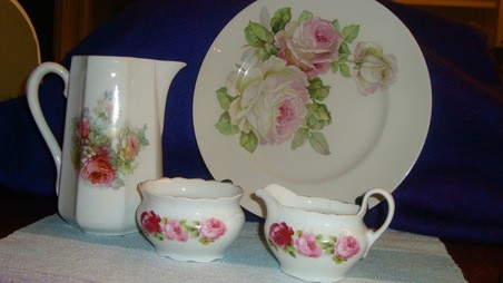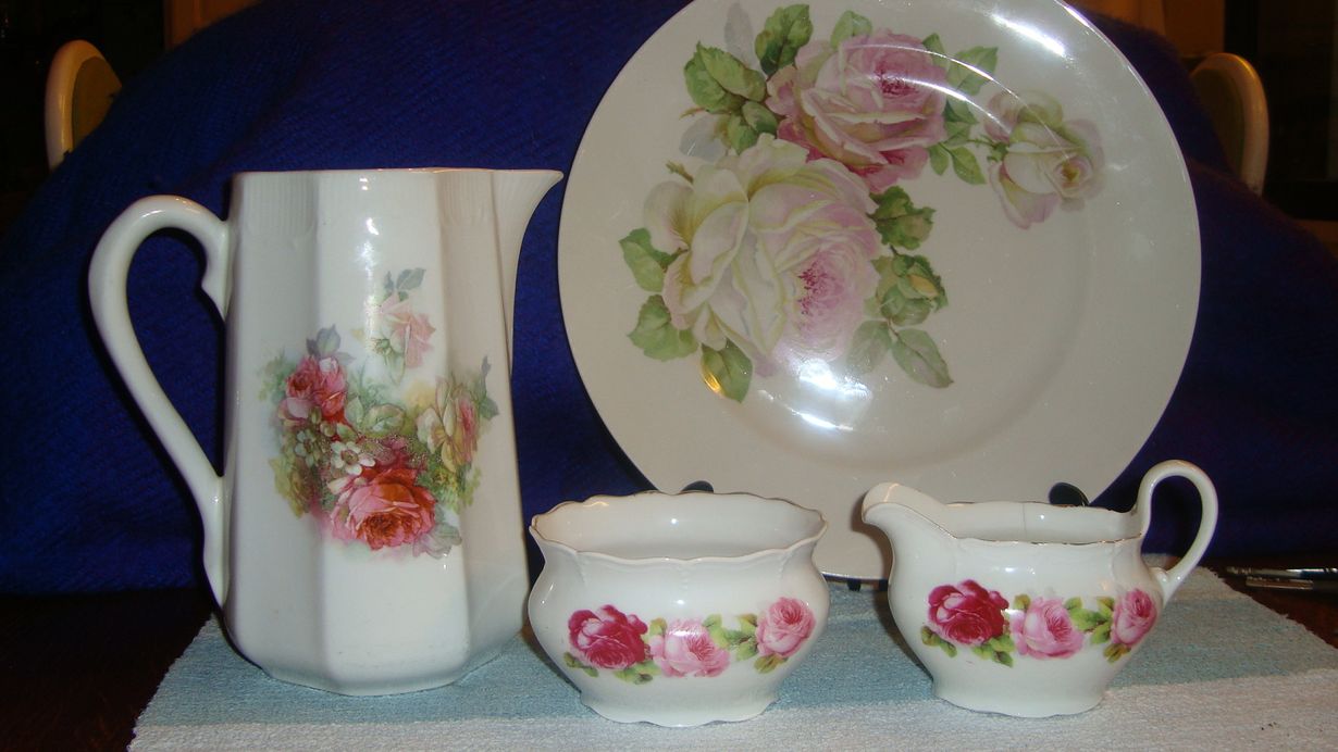 Kysyn näitten ruusuisten astioitten ikää ja arvoa. Lautasessa takana roomalaisin numeroin 2 a ja 472. Kannussa Arabian savupiippuleima. Kemakko/sokerikossa lukee tehdas Lampinen.Leena