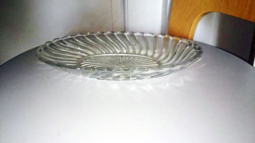 Valmistusajankohta on vähän helpompi, esine on nähnyt päivänvalon 1930–50. Silloin lasitehtaamme olivat suuria ja lasiastiat kattauksissa suosittuja – tällainen baccarat-tyylinen muotoilu oli tyylikäs. Kokonsa puolesta vati sopii esimerkiksi sillin tai jonkin leikkeleen/lisukkeen tarjoiluun.