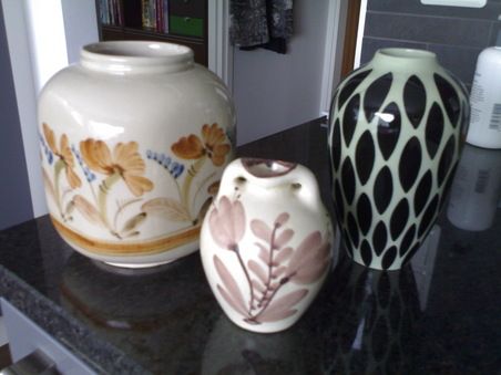 Pieni, ”korvakas” maljakko lienee Kupittaan Saven 50-luvun esineitä, sen arvo on vähäisempi. Kuvat pohjaleimoista olisivat aina paikallaan, jotta esineitten iästä ym. seikoista saisi lisätietoja.