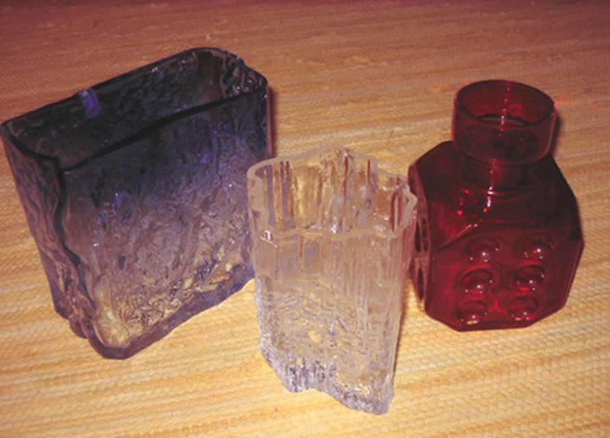 Väritön maljakko on Tapio Wirkkalan Iiittalalle 1970-luvulla suunnittelemaa massatuotantoesineistöä. Sinertävä maljakko on Kaj Blomqvistin Kumelalle 1960-luvulla suunnittelma. Arpakuutiomaljakko on Helna Tynellin Riihimäen Lasille 1960-luvulla piirtämiä esineitä. Esineiden päivän hinnat ovat 40–70 euroa/kpl. Arpakuutio on suosittua keräilytavaraa, näistä kolmesta paras.