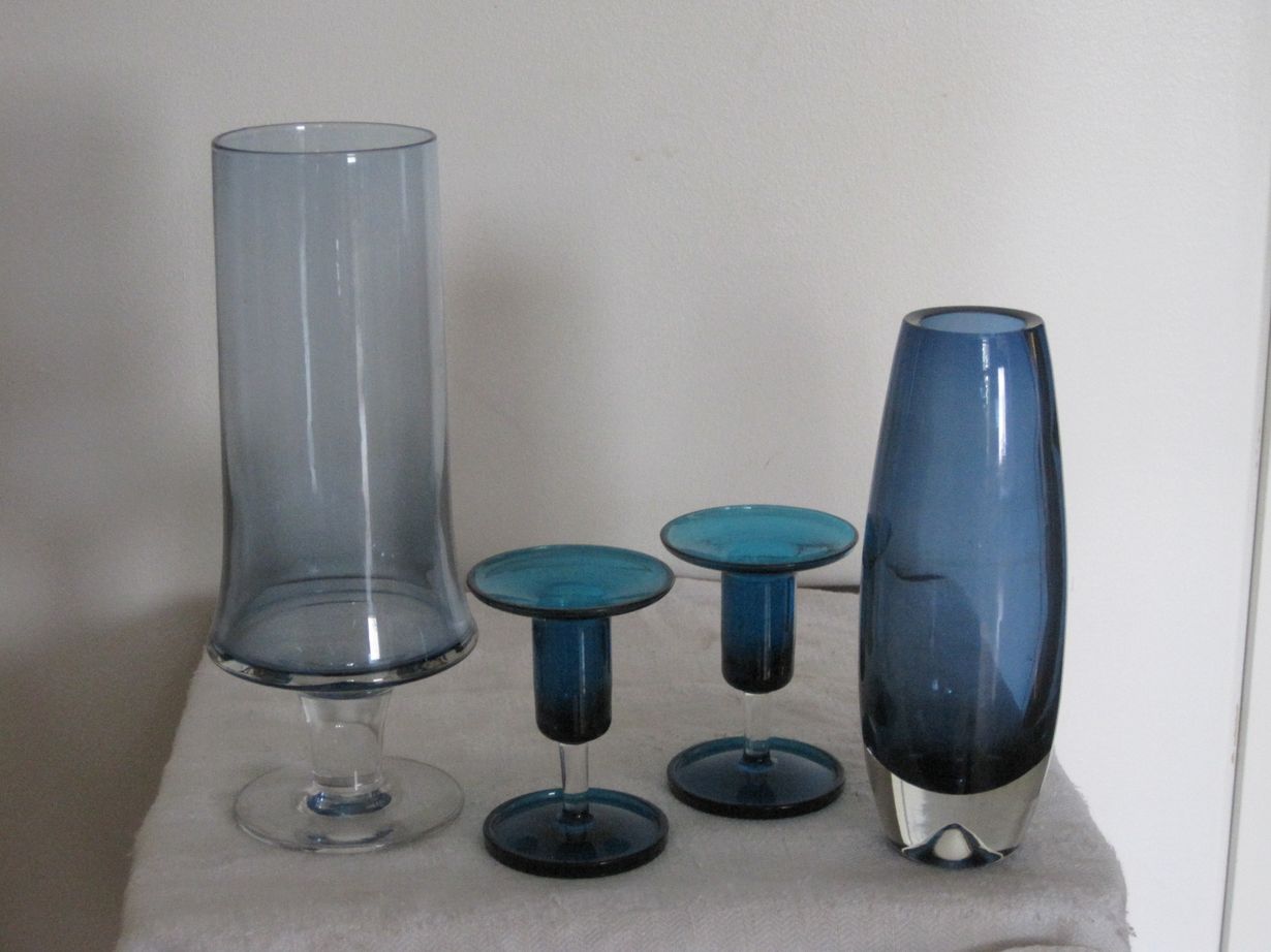 Minkä arvoisia ovat lasiesineeni? Sinisen maljakon pohjassa on signeeraus Erkki Vesanto 3654, kynttilänjaloissa lukee Riihimäen Lasi Oy Nanny Still.Sirpa