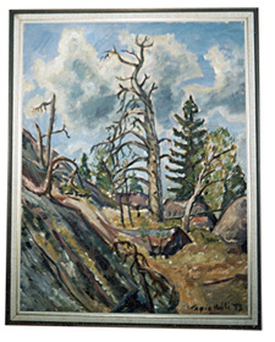 Hyvinkäällä vaikuttanut Tapio Haili (1927-1986) oli omimmilllaan graafikko, hän teki mm. paljon väripuupiirroksia ja etsauksia. Öljyväritöitä hän maalasi huomattavasti vähemmän. Hiukan alakuloisen kelopuumaiseman arvo voisi olla 250-350 euroa.