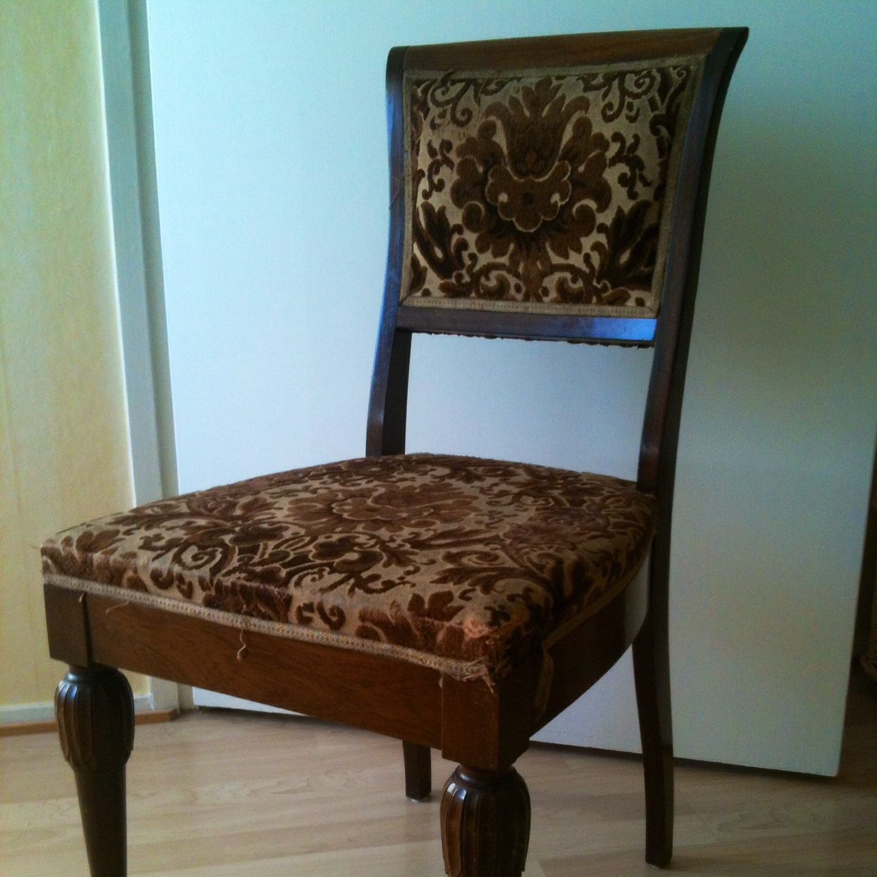 Mitä tyyliä kuvan tuoli on? Minulla on näitä neljä kappaletta. Niissä on käsitykseni mukaan alkuperäinen kangas, sama kangas oli 1923 otetussa kuvassa. Mikähän tuolin/tuolien arvo on?Hili