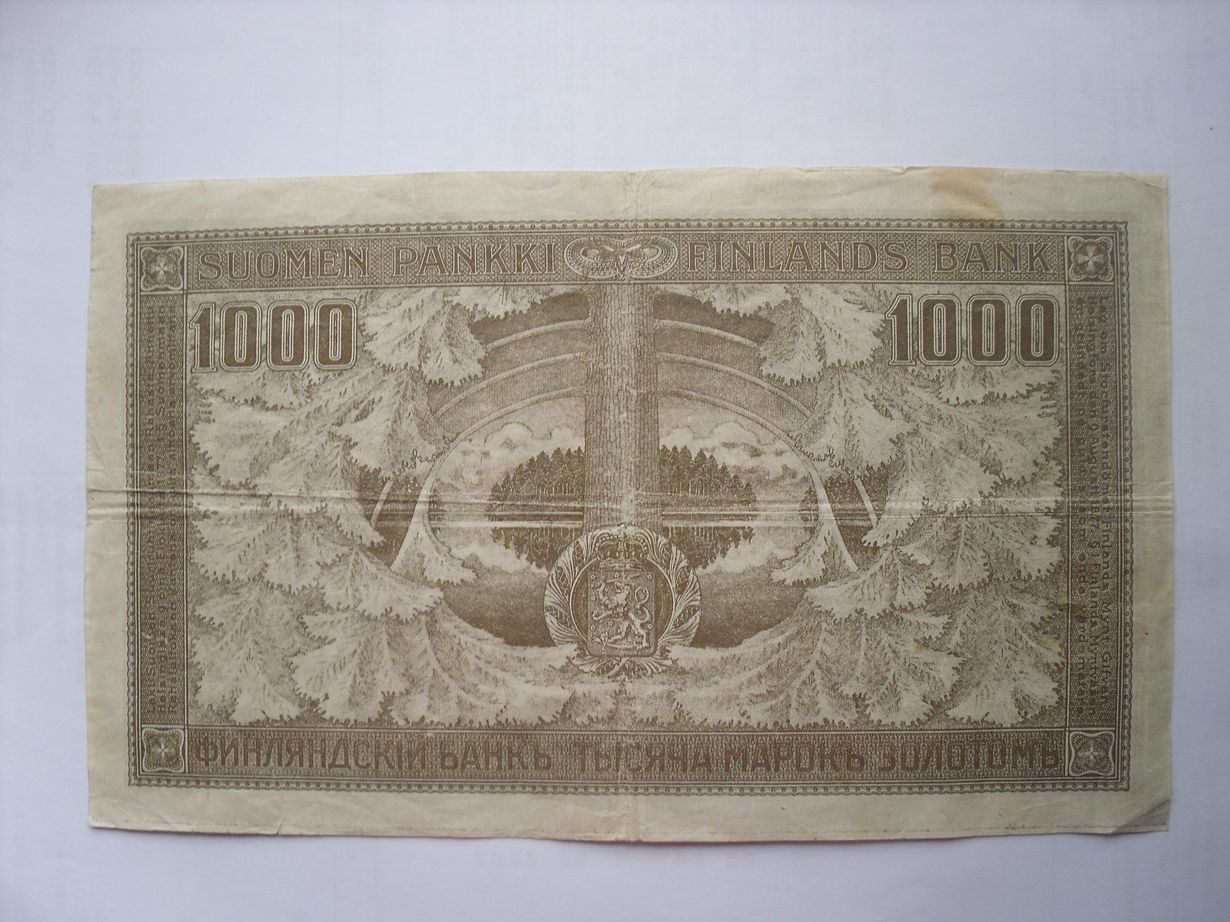 Minkä arvoinen tämä seteli on? Se on 1000 mk vuodelta 1909. Setelin tauspuolen reunassa on teksti: Laki Suomen Suurruhtinaanmaan Rahasta. Annettu Helsingissä 9-p:nä Elokuuta 1877. §1 Suomenmaan Rahalaitoksen kantana on kulta ainoana arvomittana. Seteli on täysin ehjä. Miia