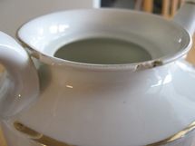 Niin se on: muuten ehjä, mutta vikoja on. Tämä valkoinen Kuznetsovin talousposliini ei ole vielä hirveän harvinaista Suomessa, sillä Karhulan lasitehdas toimi Kuznetsovin tuotteiden maahatuojana sata vuotta sitten.