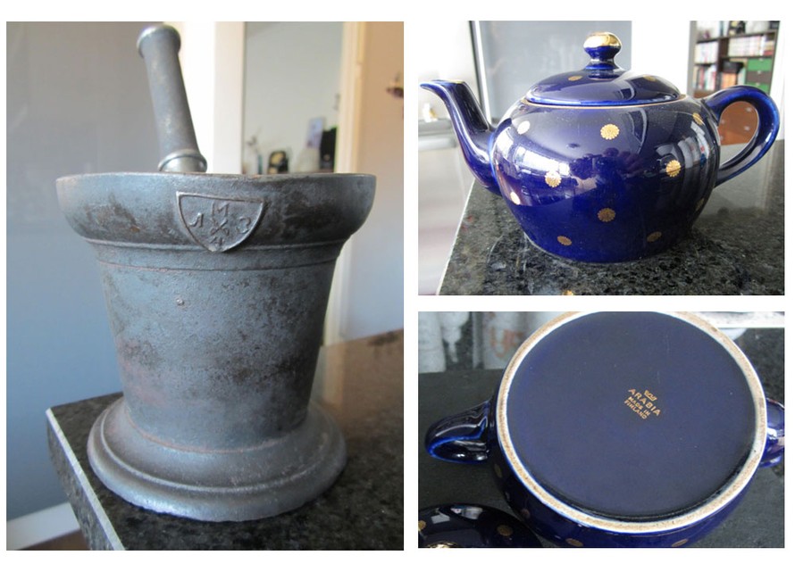 Mikä on esineitteni ikä ja arvo? Koboltinsininen teekannu on arvioni mukaan 1950–60-lukujen esine. Vai onko vanhempi? Valurautainen mortteli on kulkeutunut ennen sotia mummoni kotoa Uudeltakirkolta Lahteen. Morttelin yläreunassa on jokin merkintä. Nimimerkki Kaarina
