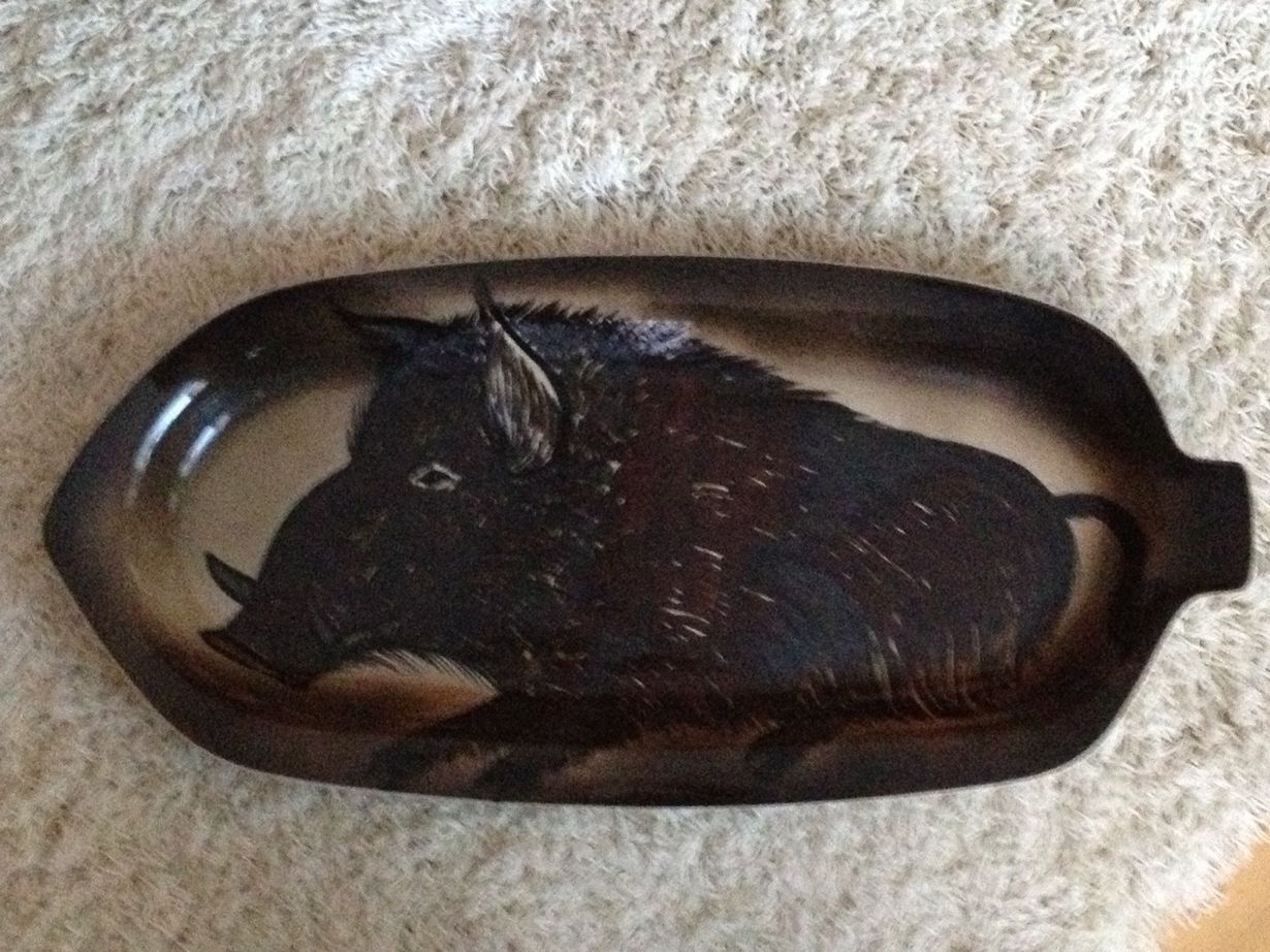 Aihe lienee siis harvinainen, ja Arabian ateljeetyötä tämän sarjan esineet ovat, kuten pohjamerkinnätkin kertovat, taidekeramiikkaa siis. Sinänsä kuva-aihe ei hirveästi muuta esineen arvoa, mutta aina on keräilijöitä, joita villisika varmasti kiinnostaa. Olen jokin aika sitten arvioinut ET-lehden nettivastauksissa kala-aiheisen vadin arvoksi 80–100 euroa, tähän on pantava 20 euron villisikakorotus.