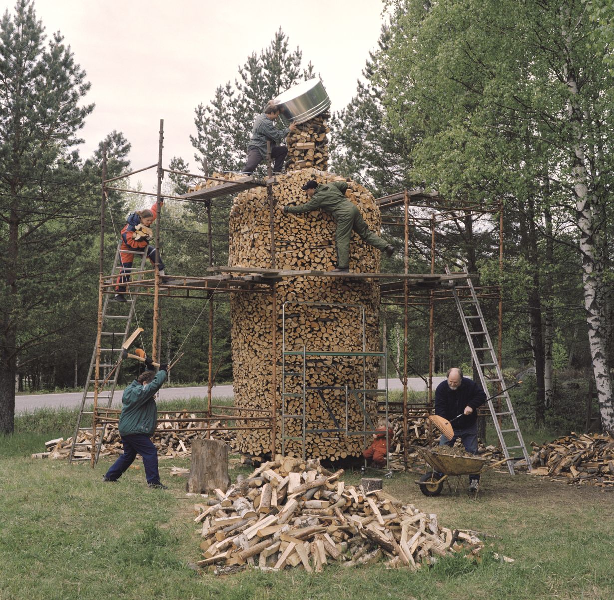 "6,5 metriä korkea pino, joka näytti Absolut-vodkapullolta. Siinä oli 24 kuutiota puuta ja kokoamiseen meni kuukausi. Korkeuden takia käytimme apuna rakennustelineitä. Komeuden kruunasi aidonnäköinen pullonkorkki, jonka teki paikallinen peltiseppä. Pino oli pystyssä yli kaksi vuotta, ja monet turistibussit pysähtyivät ottamaan siitä kuvia. Samantyyppisiä pinoja on sittemmin tehty kuulemma Ahvenanmaalla asti."