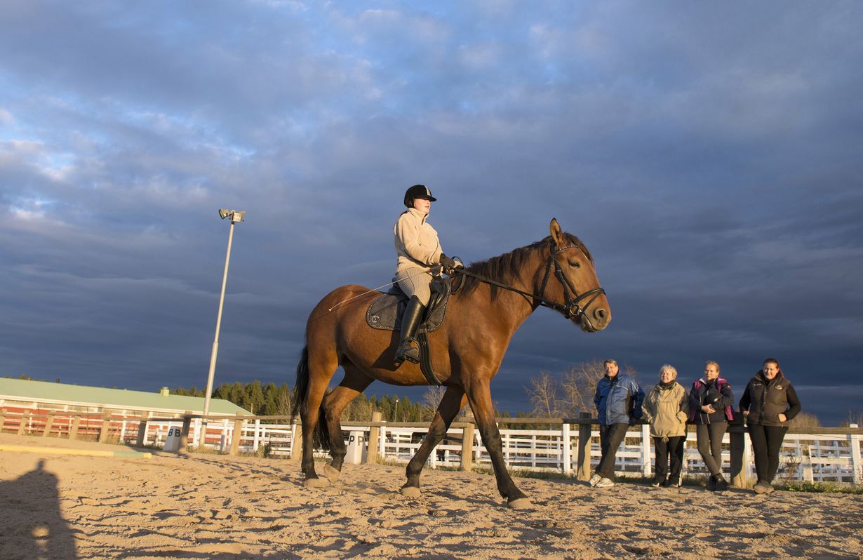 Kukaan ei huutele ohjeita, kun Ada nostaa napakasti laukan. Naiset myöntävät välillä turhautuvansa siihen, kuinka armottoman vaikeaa ratsastus on.