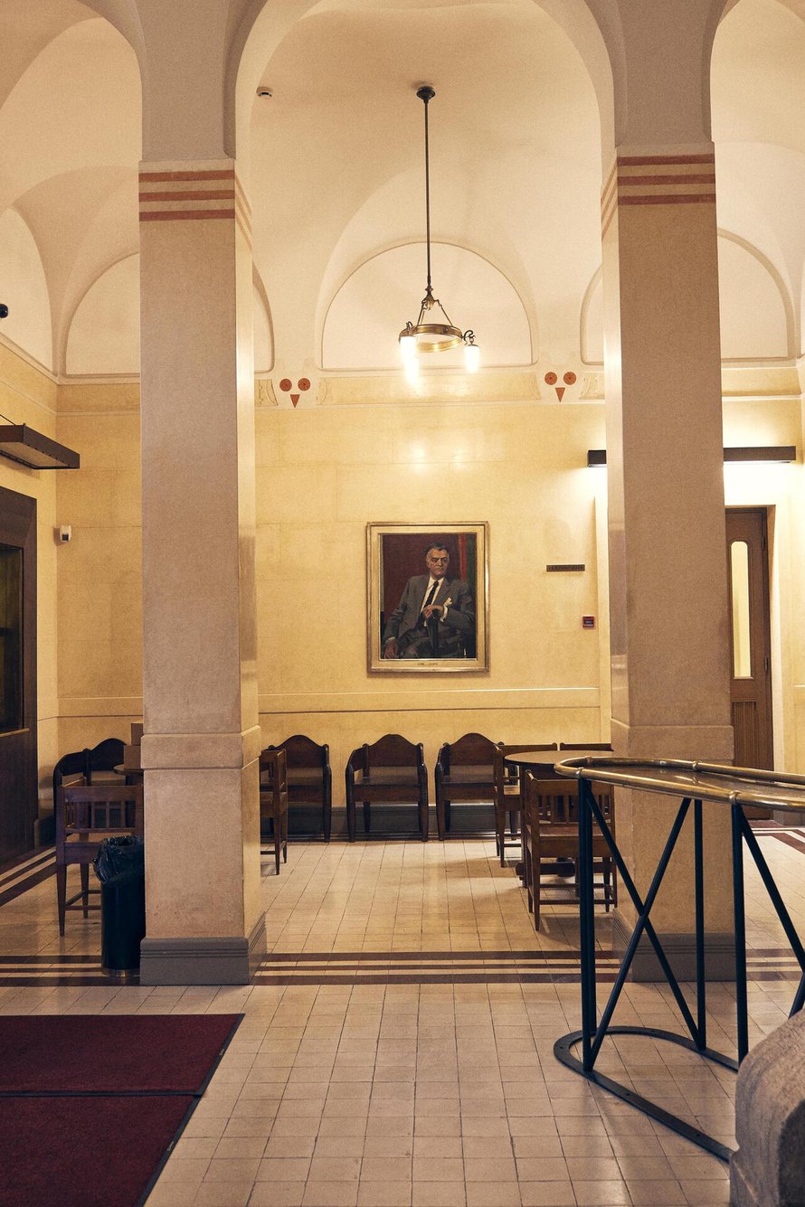 Aulassa kannattaa ihailla myös kauniin yksinkertaisia puupöytiä ja tuoleja. Ne ovat arkkitehti Eliel Saarisen suunnittelemat, kuten yläkerrosten yleisölämpiöidenkin kalusteet.