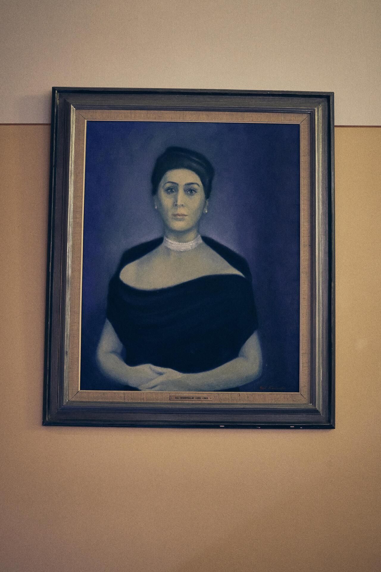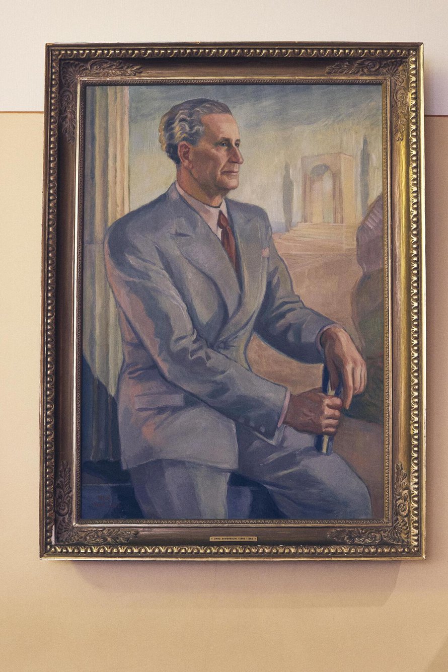 Hän on vastassa heti eteisaulassa ja aloittaa esittelyn suoraan suurimmasta: Tauno Palosta. Palosta maalattu muotokuva roikkuu eteisaulan vasemmassa päätyseinässä.