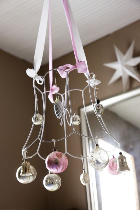 2. Kiinnitä kehikkoon erilaisia, kauniita koristeita, kuten lasipalloja, koristekelloja ja käpyjä.