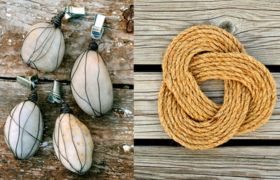 Solmeile rouheisesta sisalnarusta lautasliinarenkaat ja kieputa pöytäliinan reunaan hauskat painot.