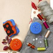 - 3. Koristele kansien näkyvät osat halutessasi napeilla. Tee naskalilla reikiä, joiden läpi napit ommellaan kansiin kiinni.