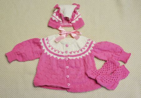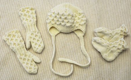 ”Olen vanhan kansan käsityöläinen eli kaikki on aina tehty kotona. Nykyisin sairaudet ovat jo koetelleet minua eikä kaikki käsityö enää onnistu. Neulominen kuuluu kuitenkin joka päivään, vaikka toinen silmäni sokeutui reilut kymmenen vuotta sitten. Lapset ja lapsenlapset, tuttavat ja omaiset saavat käsitöitä lahjaksi. Tämä suloinen neulesetti menee serkkuni pojantytölle. Käsityöt kantavat ihmistä eteenpäin, vaikka elämä kolhisikin!