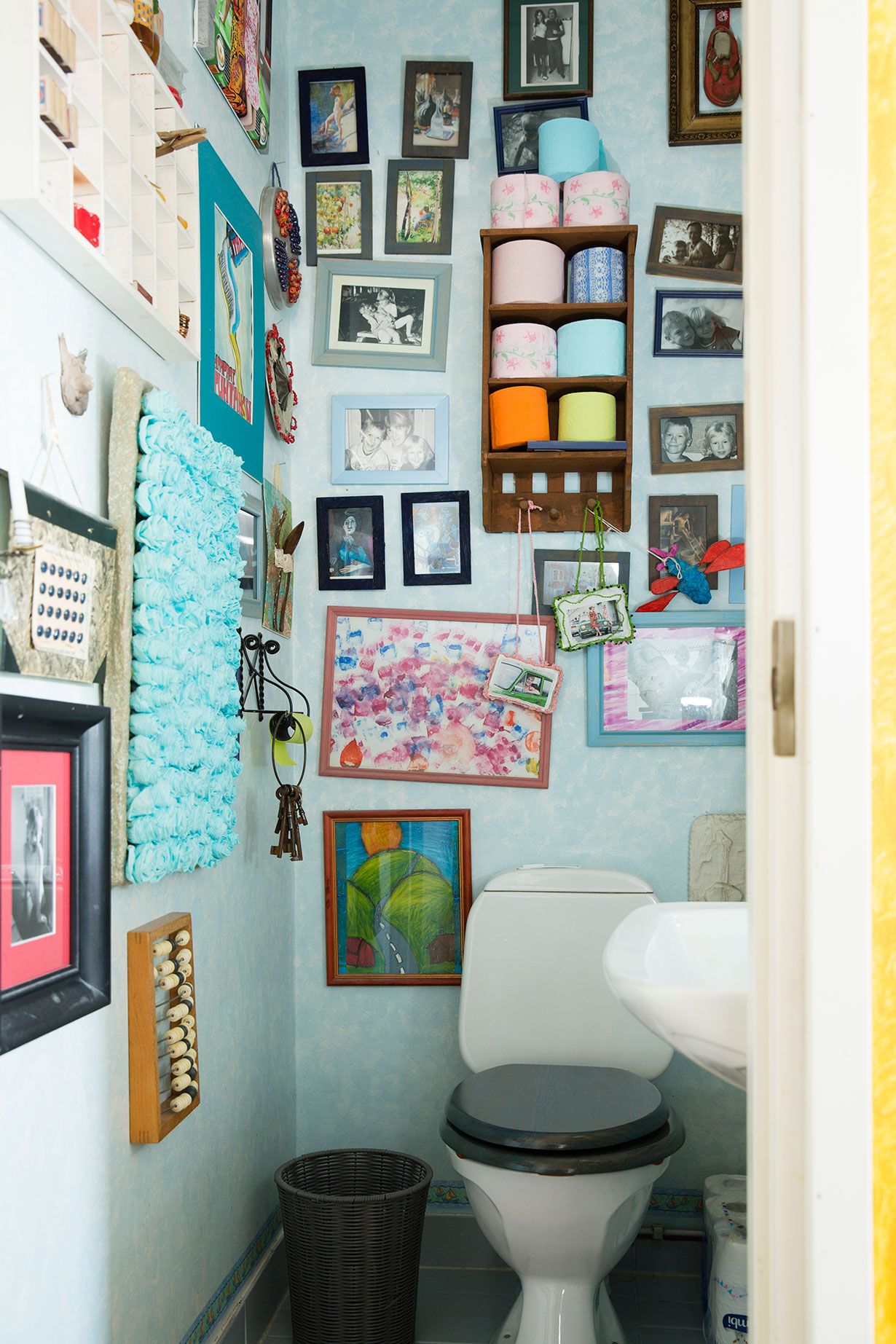 Minulla on myös taidevessa. Sen seinillä on piirustuksia, käsitöitä ja epätavallisia matkamuistoja: puolalaista värikästä vessapaperia, tsekkiläinen nappilevy ja venäläinen helmitaulu. Tyttäreni kaveri luonnehti tilaa 7-vuotiaana, ihanan epävessamaiseksi.