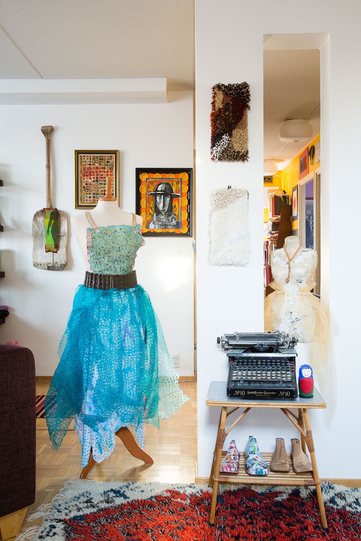 Berliinistä askarteluliikkeestä ostamani torson pintaan olen liimannut palasia puolalaista keltaista sanomalehteä, vaaleanpunaista Financial Timesia, virsikirjan nuotteja ja kahvilla värjättyjä kirjan sivuja. Kaulakoruksi torsotar sai ruostuneen ikkunahaan ja hameeksi kiinnitin nuppineuloilla palan tylliä. Puolikkaat rintaliivitkin hänellä on selkäpuolella. Se on esillä olohuoneessani.