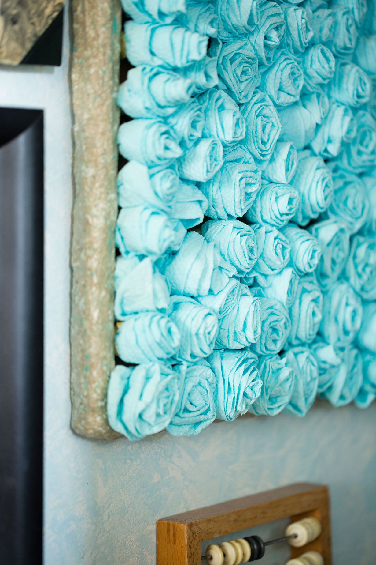 Värikkäästä vessapaperista voi tehdä vaikka ruusutaulun vessaan. Vanha helmitaulukin on päässyt toiletin seinälle.
